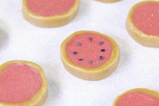5. 在曲奇表面刷上一层西瓜汁,放入预热好的烤箱中烘烤。